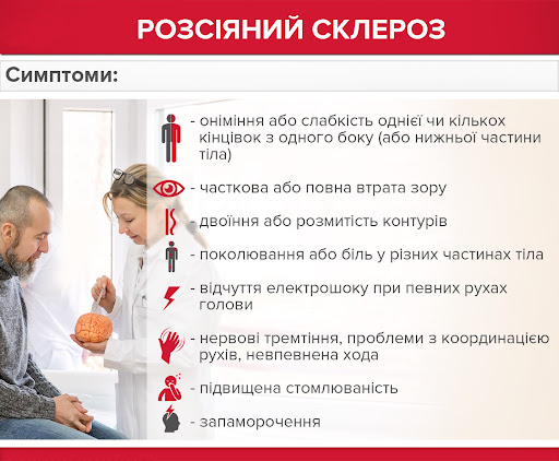 Розсіяний склероз вражає різні відділи нервової системи, що спричиняє різноманітні симптоми: хтось може частково втратити зір, у когось почнуть німіти й відмовляти кінцівки, хтось втратить координацію, ін. – симптоми неспецифічні й у всіх проявляються по-різному – саме тому розсіяний склероз часто називають «хворобою тисячі облич». Немає єдиного «сценарію», за яким розвивається розсіяний склероз, його симптоми часто залишаються непоміченими на перших стадіях. Тому обов’язково необхідно звертатися до лікаря, якщо помітили такі його ранні ознаки: